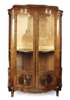 the moulded plinth top over a pair of glazed serpentine doors, the lower panels painted with scenes of courting couples and landscapes, the whole with gilt metal mounts, raised on short cabriole legs