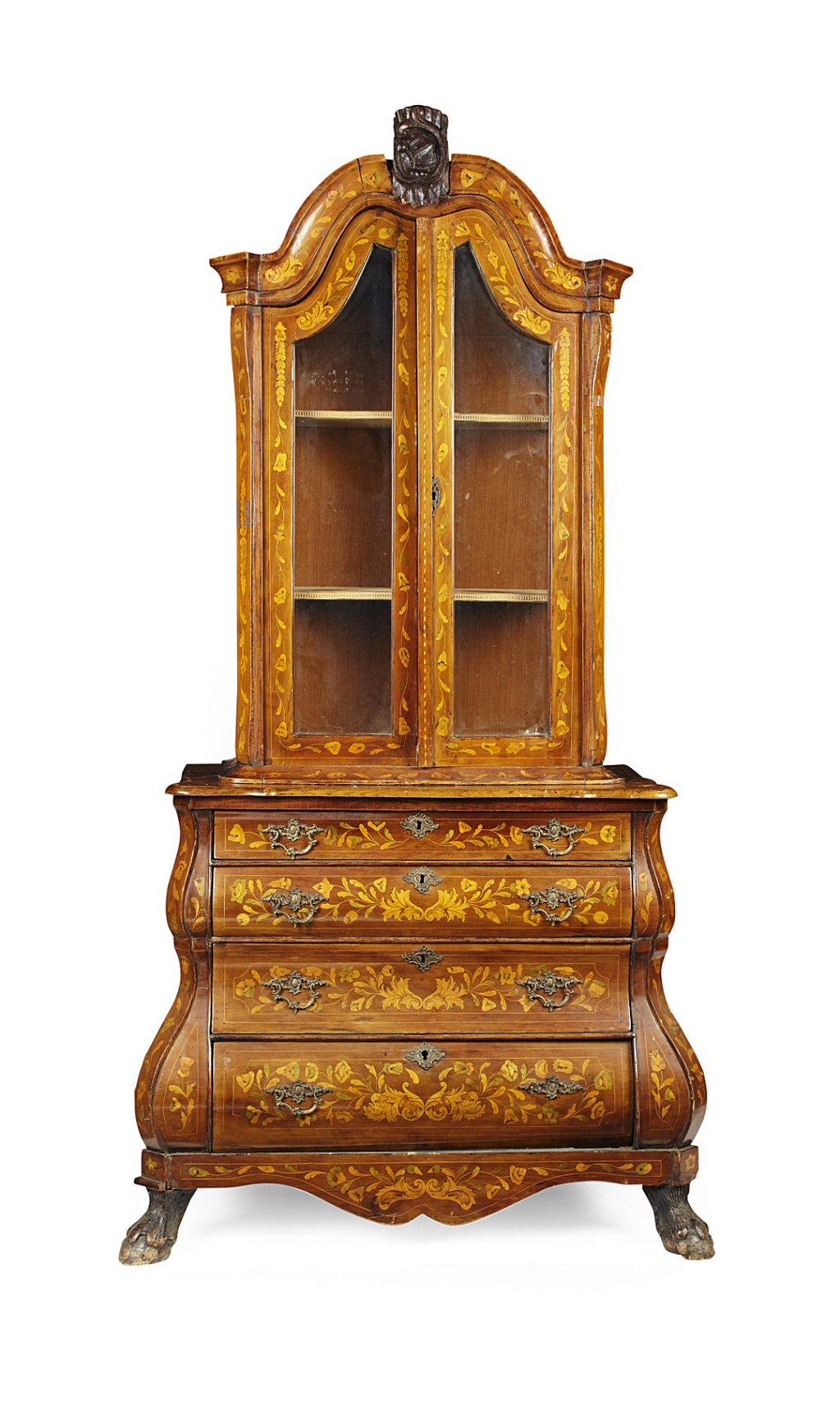 the domed top centred by a shell carved cresting, above a pair of glazed panel doors, the lower section fitted with four long graduated drawers, raised on claw and ball feet