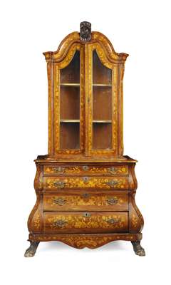 DUTCH WALNUT AND MARQUETRY BOMBE CABINET ON CHEST