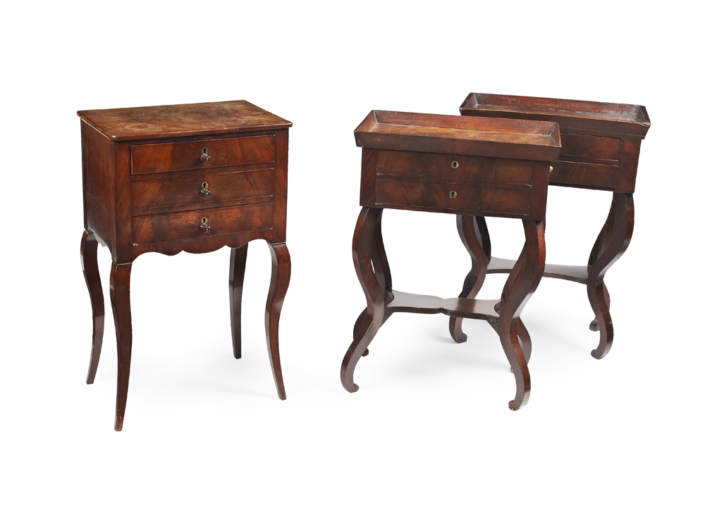 tray tops over two long drawers, raised on scrolled legs joined by a shaped undertier; 52cm wide, 71cm high, 33cm deep and 50cm wide, 70cm high, 33cm deep; together with another French walnut side table, 44cm wide, 73cm high, 30 cm deep (3)