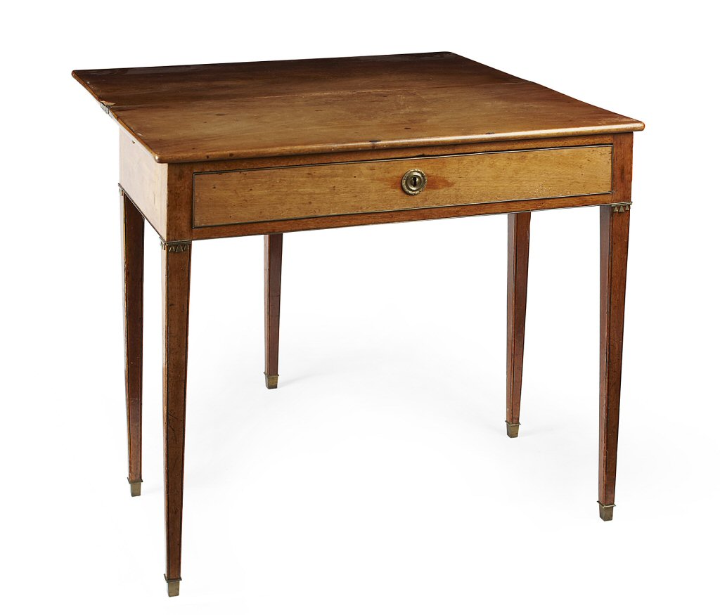 the rectangular fold over top above a long brass lined frieze drawer and candle slides to the ends, raised on line inlaid square tapered legs with brass caps