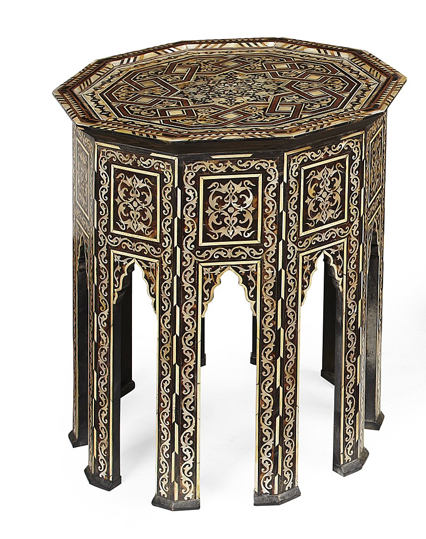 the decagonal top with interlaced geometric inlay and mother of pearl foliate scroll panels, raised on ten inlaid legs separated by ogee arches