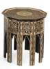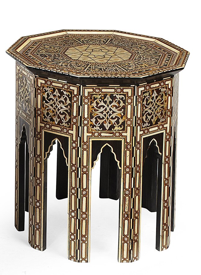 the decagonal top centered with a mother of pearl star motif enclosed by alternating panels of scrolls and Islamic text, on legs separated by ogee arches