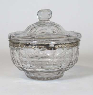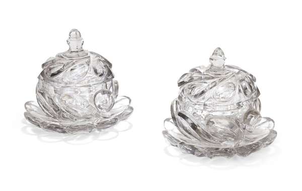 PAIR OF ENGLISH GLASS COMPORTS, COVERS AND UNDERPLATES