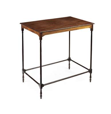 the rectangular top with a moulded edge over a narrow frieze, raised on slender circular legs united by a peripheral stretcher