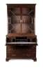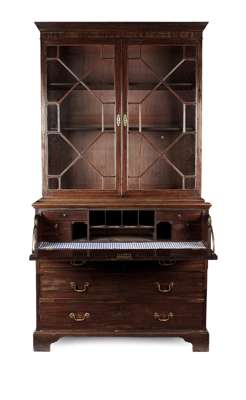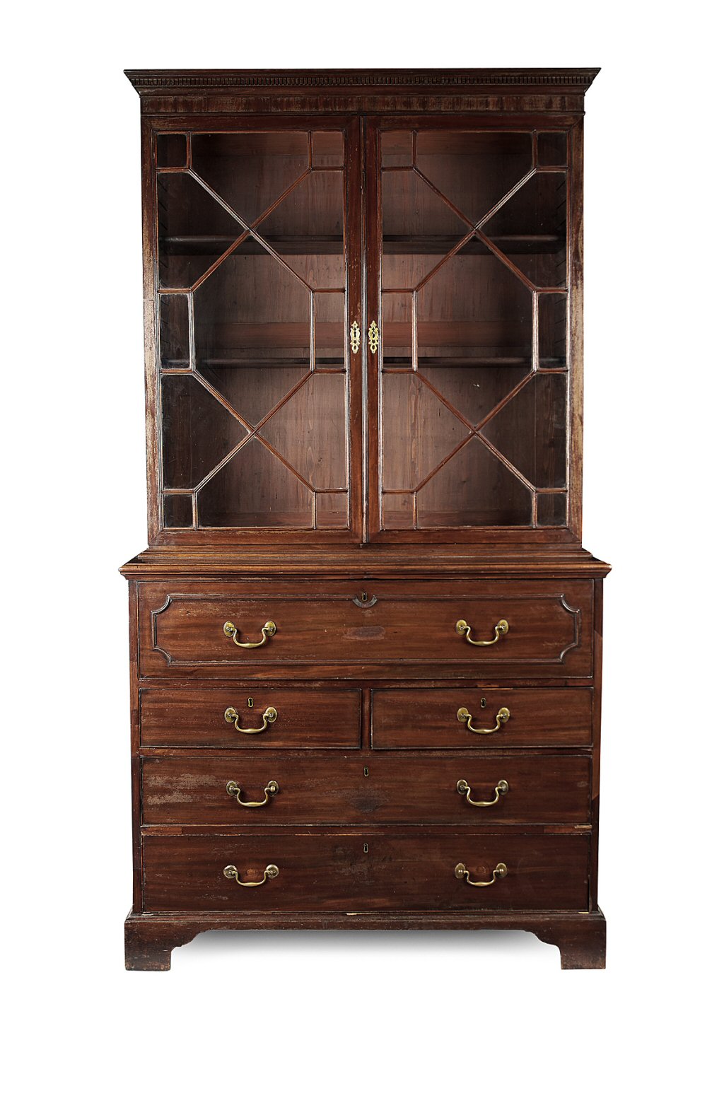 the cornice with a dentil moulded frieze over a pair of astragal glazed doors opening to shelves; the lower section with a long dummy drawer opening to an interior fitted as a desk, over two short and two long drawers and raised on bracket feet