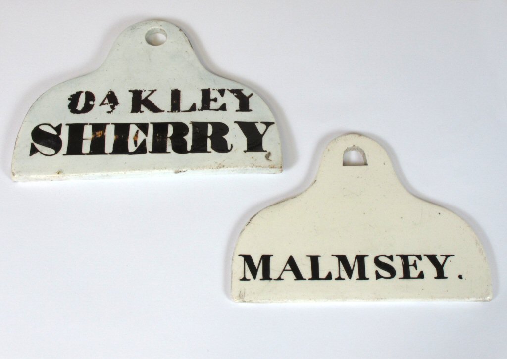 of typical form, one labelled 'Malmsey', 12cm wide; the other labelled 'Oakley Sherry', 13.5cm wide (2)