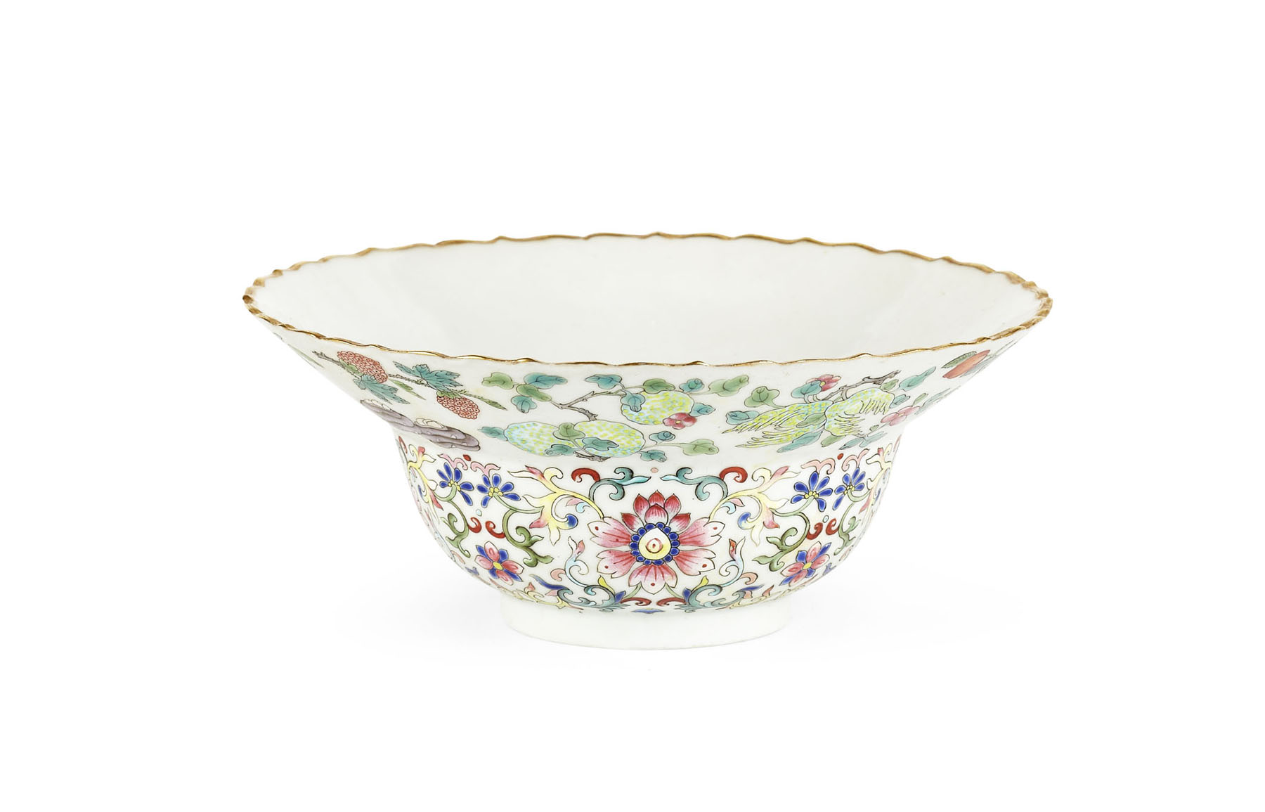 the exterior profusely decorated with fruit above a scrolled lotus border, gilt rim, red seal mark to base