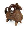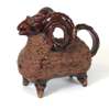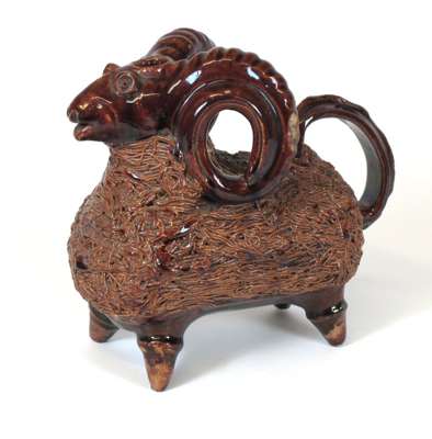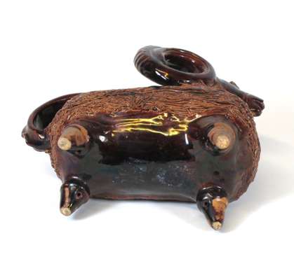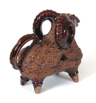 modelled with with large curving horns, its tail forming a handle and covered with extruded clay 'wool', in dark brown glaze