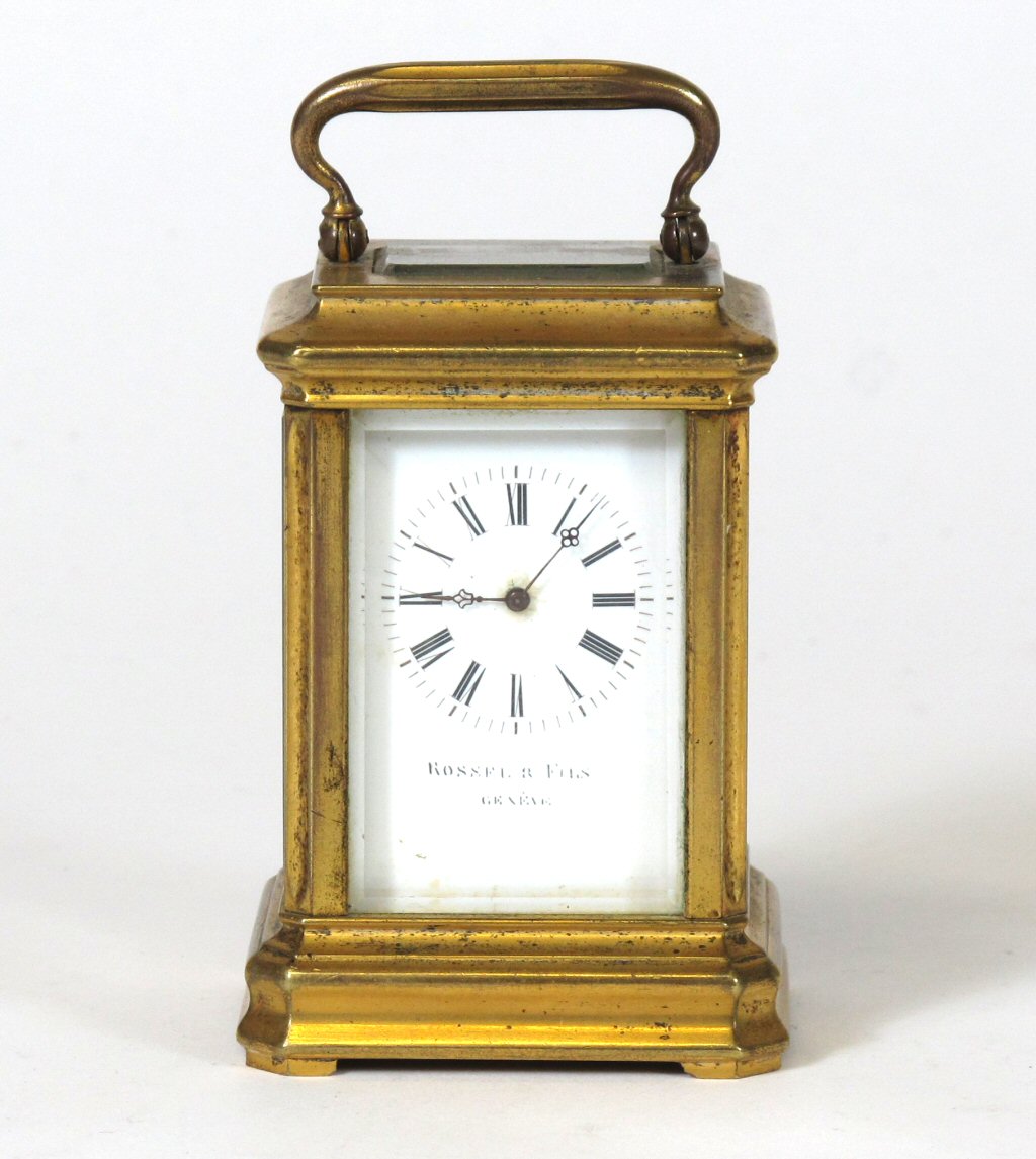 cylinder movement, the white enamel face with Roman numerals and marked 'Rossel et Fils/ Geneve', in a brass and glass mounted case with bail handle