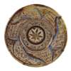 in dark brown lustre and blue glaze, centrally painted with a star and dot motif with a band of hatched leaves, dots and scrols, the broad rim with flattened leaves and stylised flowers on alternating grounds with stalks and wheat, with a pierced hanging hole; the reverse with a radiating band
