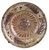 in brown lustre and blue glaze, the central boss with radiating blue leaves within a gadrooned band, the border with four flattened leaves in relief outlined in blue against a ground with fruit motifs, trefoils and leaves, the edge with a band of half circle loops, 'de la ungla', with a pierced hanging hole; the reverse painted with patterns of ferns, whorls, and concentric bands around a central flower head