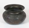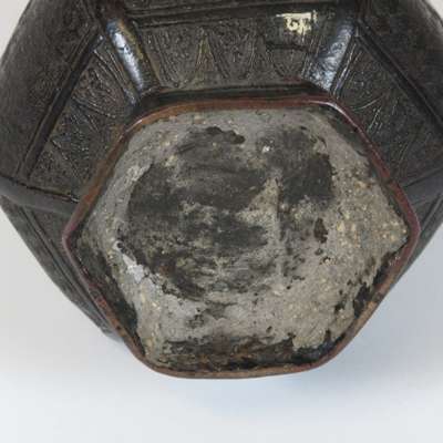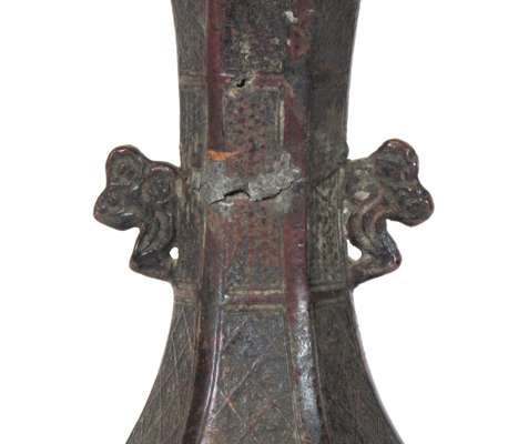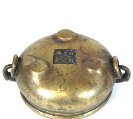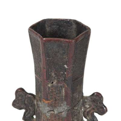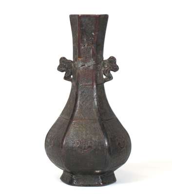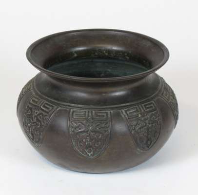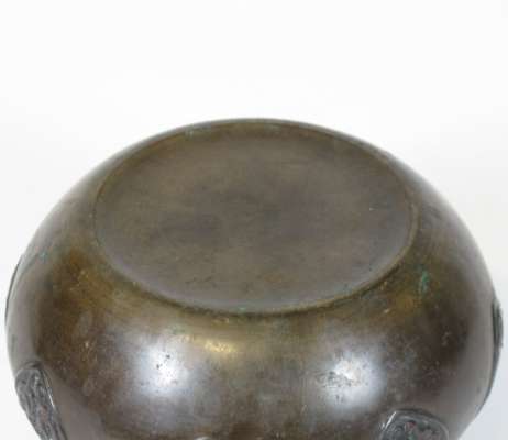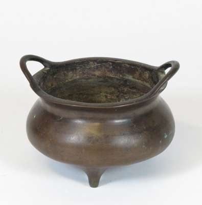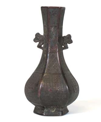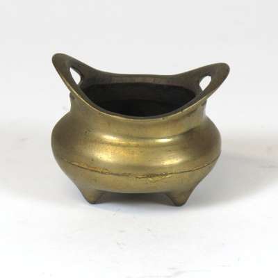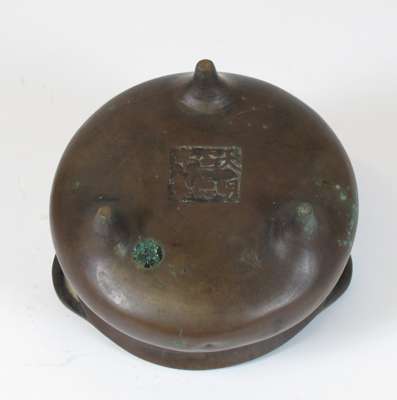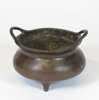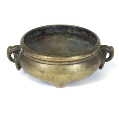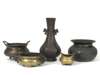 comprising: a twin handled bronze censer, Zuande mark, but later, 8.5cm high; a twin handled brass tripod censer, Zuande mark, but later,4.5cm high; a small twin handled brass tripod censer, indistinct mark, 5cm high; a bronze bowl of ovoid form with everted rim and dragon panels, 9cm high; and a bronze bottle vase of hexagonal form, decorated with masks and geometric designs, 19.5cm high (5)