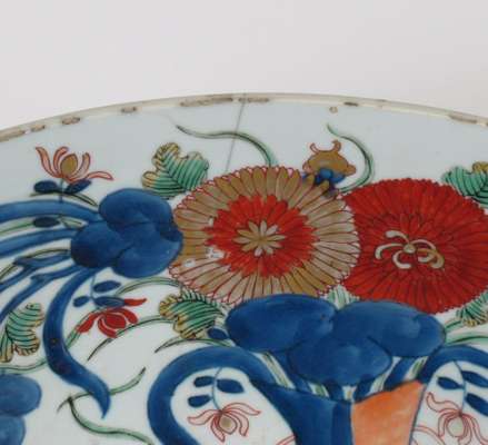 ciruclar form with powder blue and ruffed gilt decoration with narrow rouge de fer bands, the interior brightly painted in Imari and famille verte enamel, with bouquets of stylised chrysanthemums