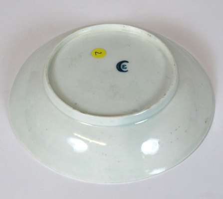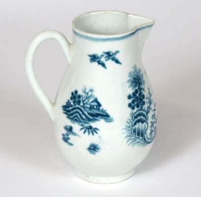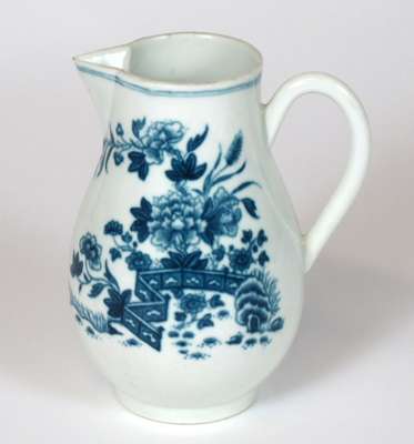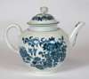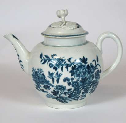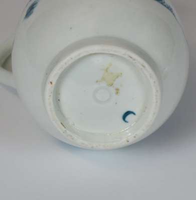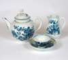 comprising a teapot of globular form, the cover with flower shaped finial, blue crescent mark, 14.5cm high; a sparrowbeak milk jug, teabowl and saucer, similar pattern, blue crescent mark, jug 11.5cm high, bowl 4cm high, saucer 12cm wide (4)