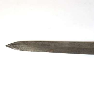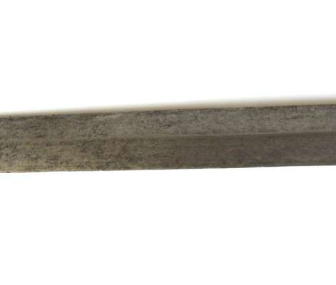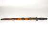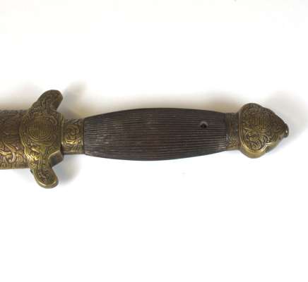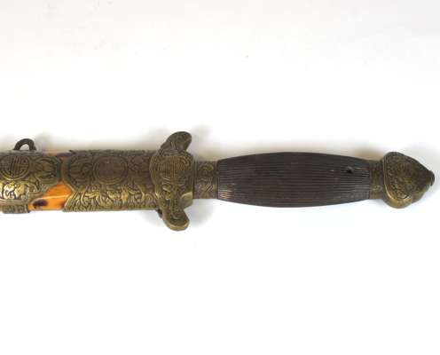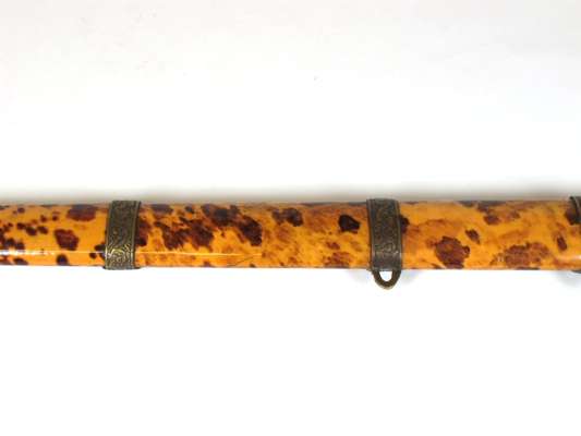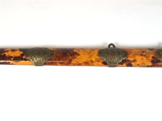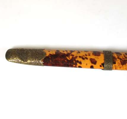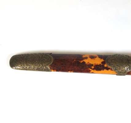 wood handle and brass mounts with bat and shou motifs, the blade contained in a tortoiseshell scabbard
