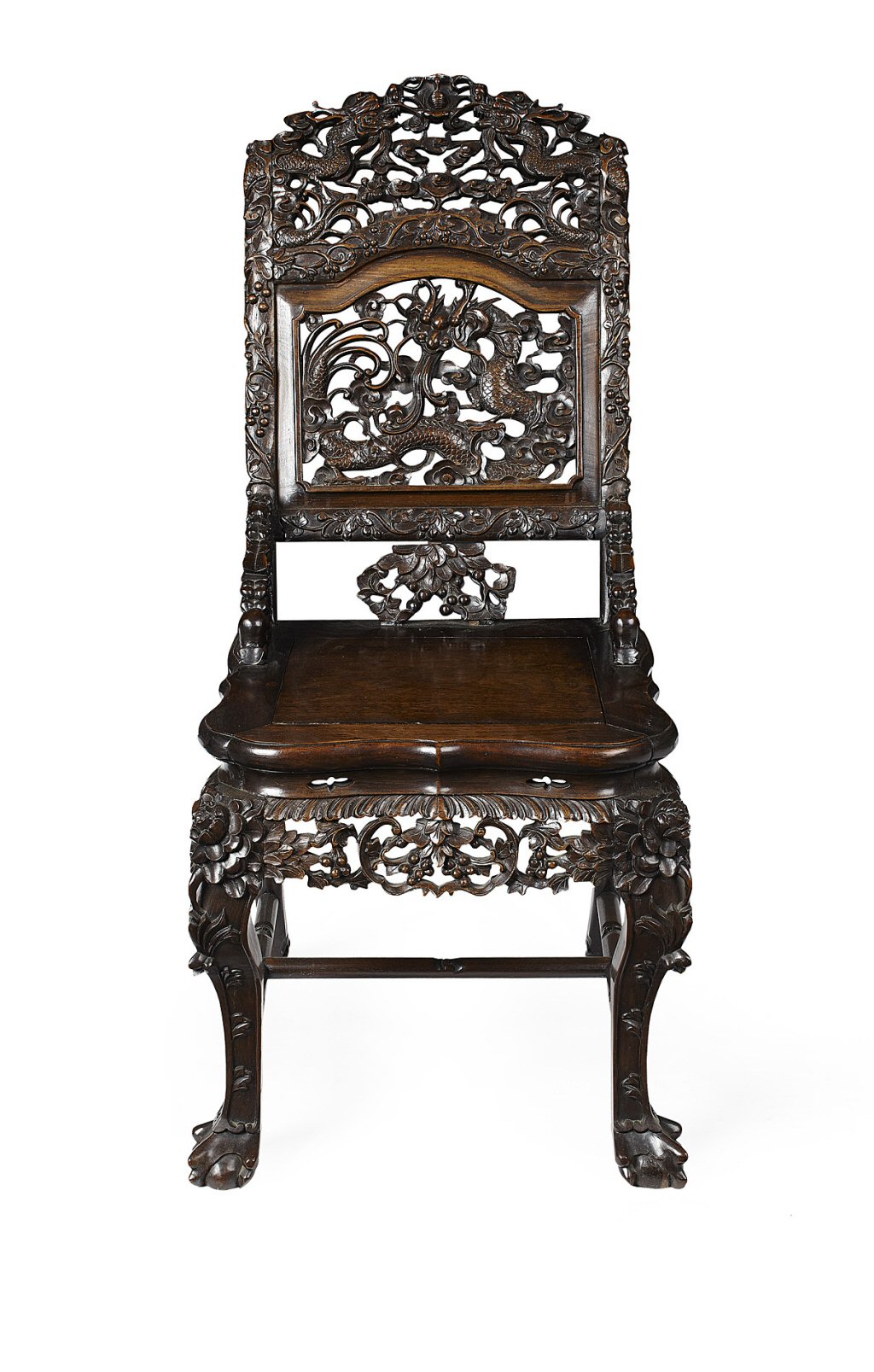 the arched back panel pierced and carved with dragons amidst clouds, above a shaped seat over a fruit and foliate carved apron, raised on cabriole legs ending in claw and ball feet