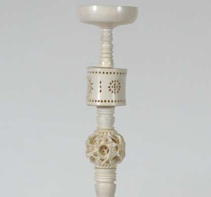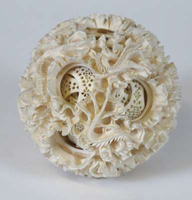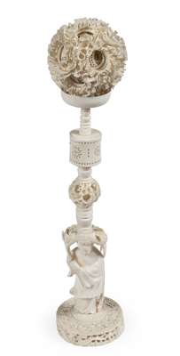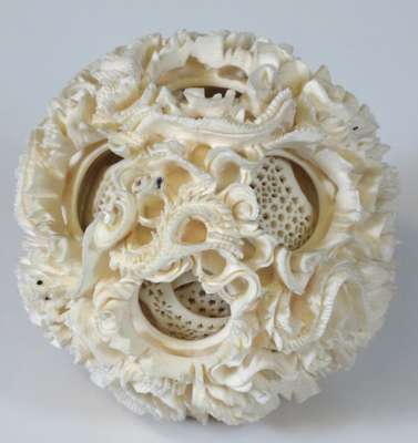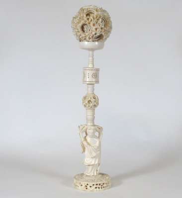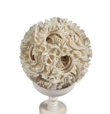 LARGE CHINESE CANTON CARVED IVORY PUZZLE BALL AND STAND