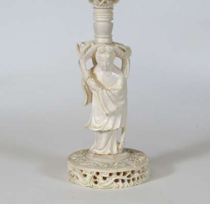 profusely carved with dragons, 9cm wide; the stand enclosing a small puzzle ball above a figure of a lady holding a lotus flower on a dragon carved base, 36cm high (2)