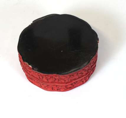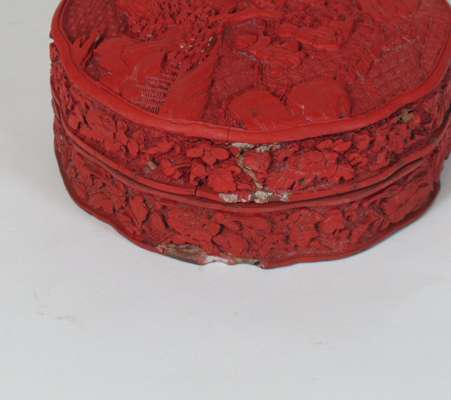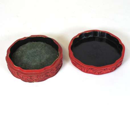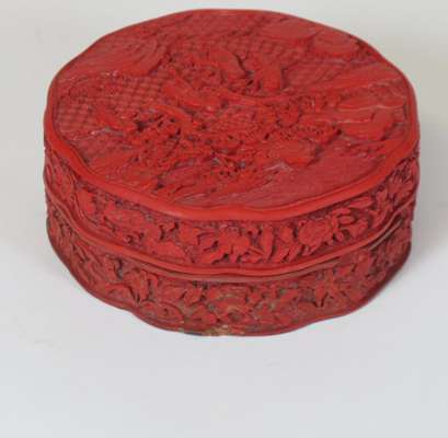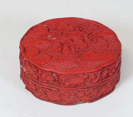 each with four carved figural panels within a lotus scroll ground, 25cm high; and a shaped circular carved lacquer box of figures beneath a pine tree in a mountainous landscape, the sides with floral decoration, 12cm wide (3)