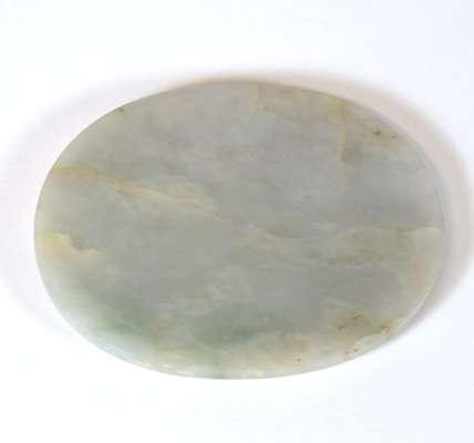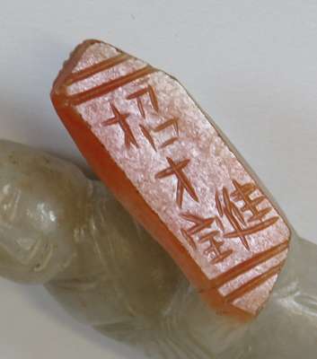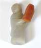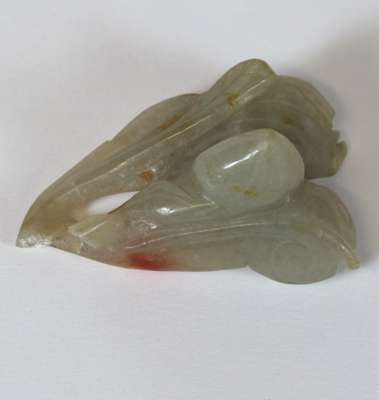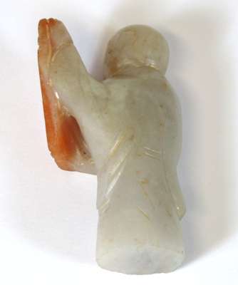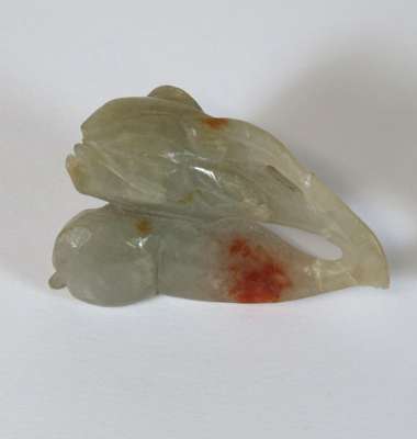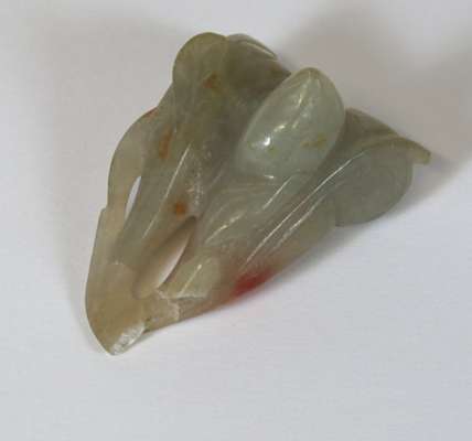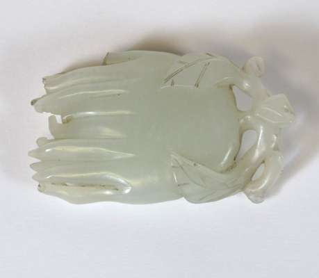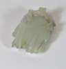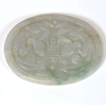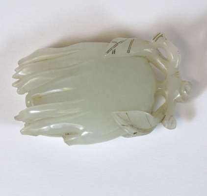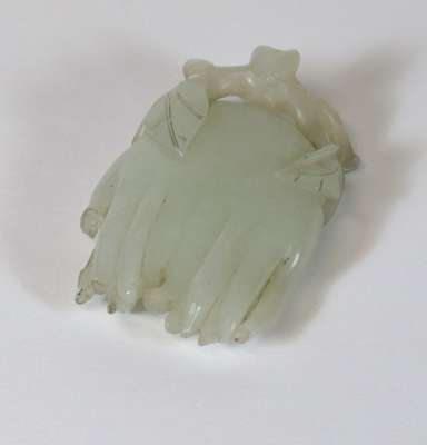 comprising a citron with leaf decoration, 6.5cm wide; a fruit, 5.5cm wide; an oval plaque with central shou motif surrounded by dragons, 7m wide; and a figure of a scholar holding a tablet with an inscription, 6.5cm high (4)