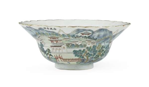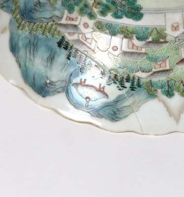 of circular form with scalloped rim, depicting a mountainous landscape titled 'White Deer Ancient Cave', verse inscription to rear from the poem by Bai Juyi 'Chant of a Tour in the Mountain', red seal mark to base