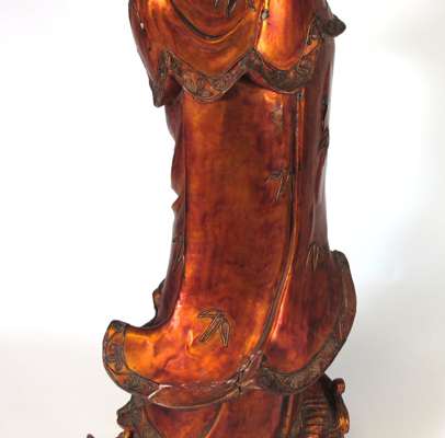 depicted in flowing robes holding the vase of immortality and sprinkling it on a fish