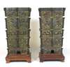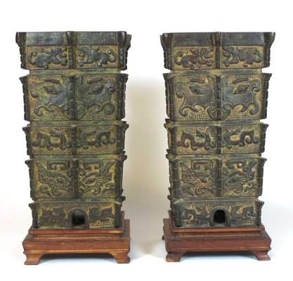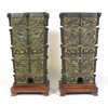 each of tapered rectangular form with taotie masks interspersed with animal motifs, hardwood stand (2)
