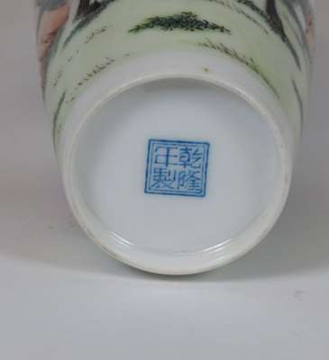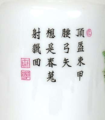 of tapering cylindrical form, depicting a soldier on horseback returning from the Spring hunt, the verso with calligraphic inscription, blue Qianlong seal mark, but later