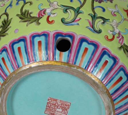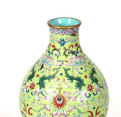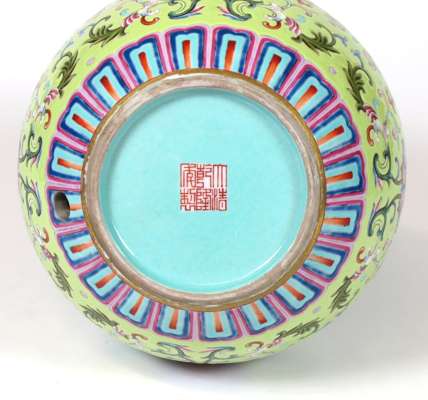 decorated in polychrome with scrolling lotus on a yellow ground, red Qianlong seal mark to base, but later