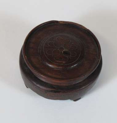 comprising a twin handled bowl, of circular form with rams head masks, 9cm wide, 3.5cm high; and a twin handled bowl of circular tapered form with flat handles, and a stained wood stand, 10cm wide, 3.5cm high (2)