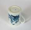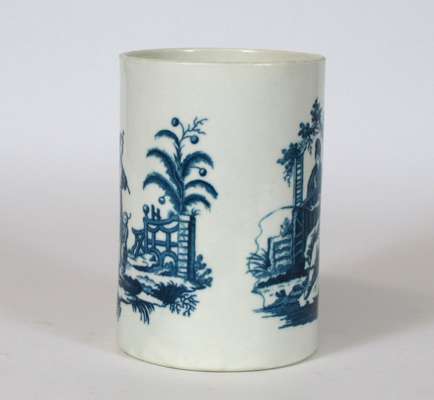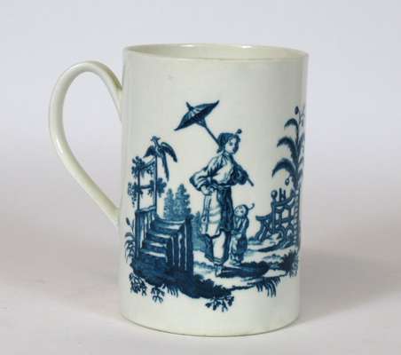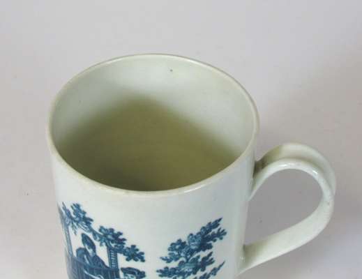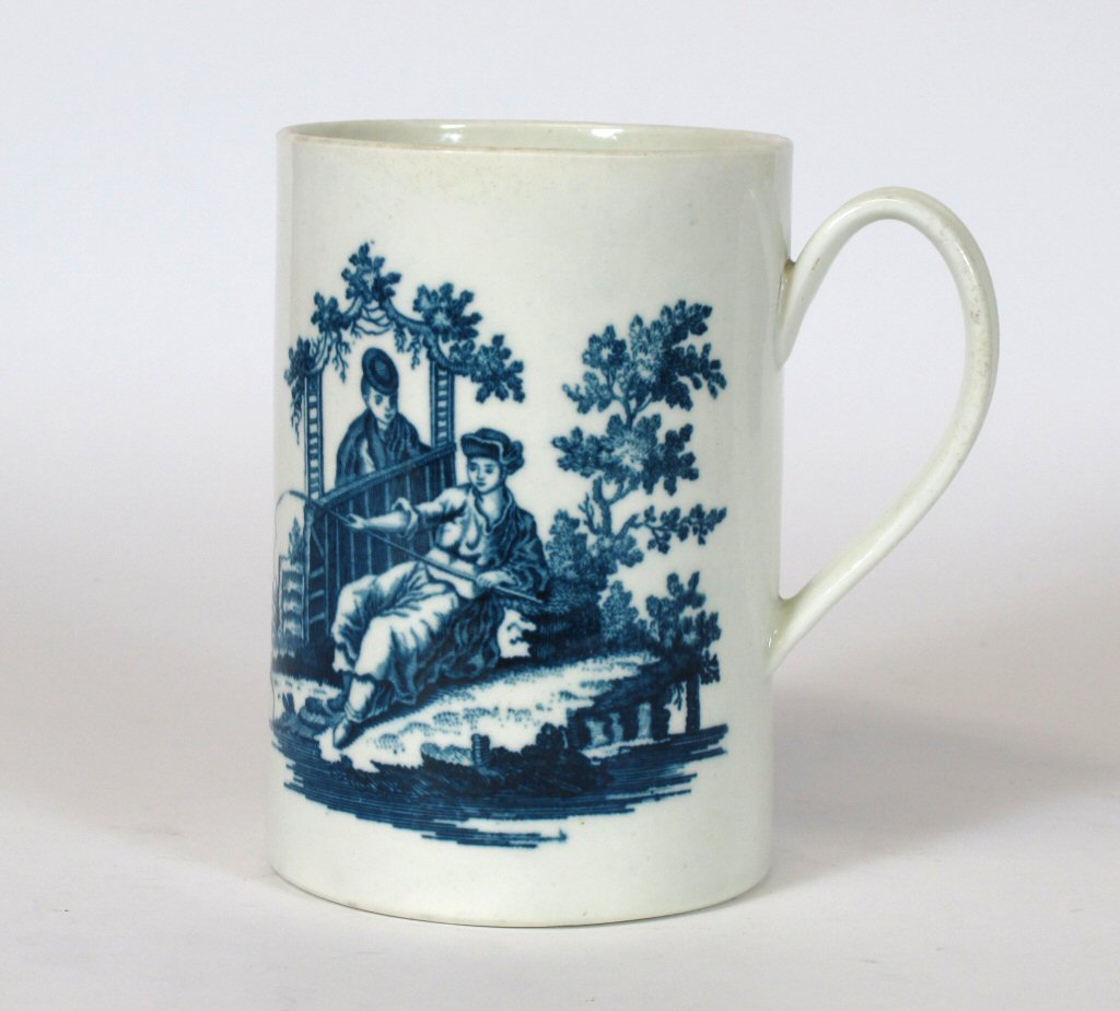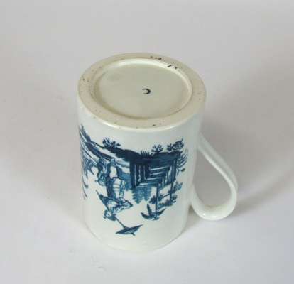 of cylindrical form with plain handle, decorated to one side with 'La Promenade Chinoise' and to the other side with 'La Peche', blue crescent mark