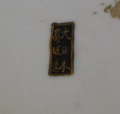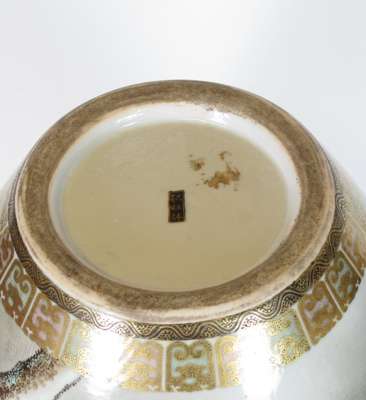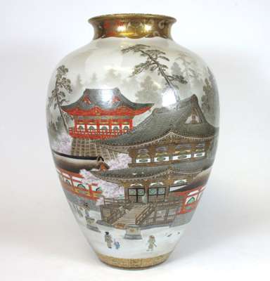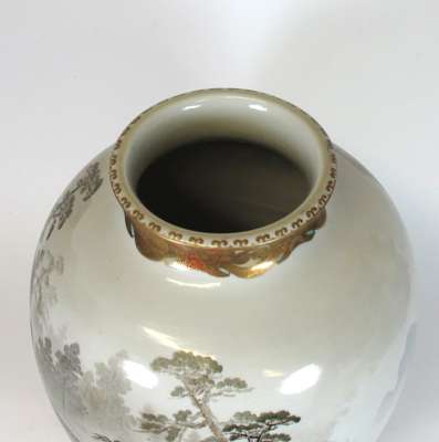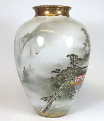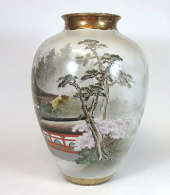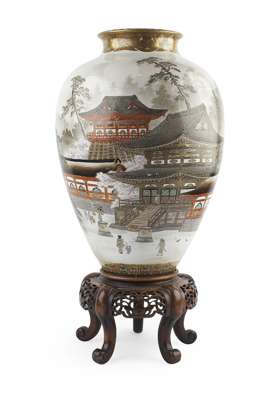 of ovoid form, decorated with pavilions in a wooded landscape, gilt six character mark and a stained wood stand