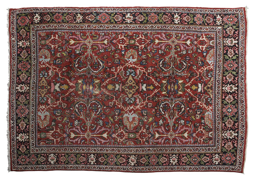 the red field with central small camel lozenge medallion surrounded by scrolling foliate pattern, within dark brown palmette, rosette and vine border between cream bands