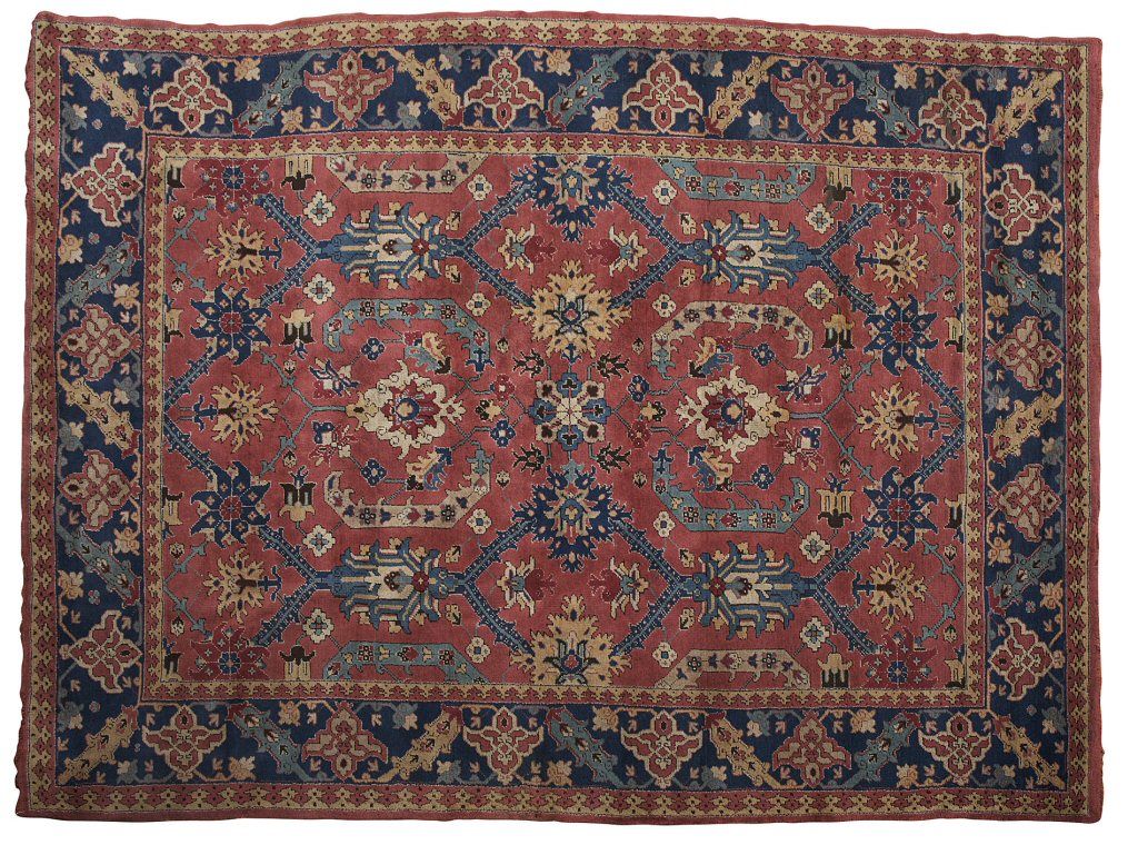 the rose pink field with central rosette and allover polychrome palmette and angular vine pattern, within indigo palmette and vine border between bands