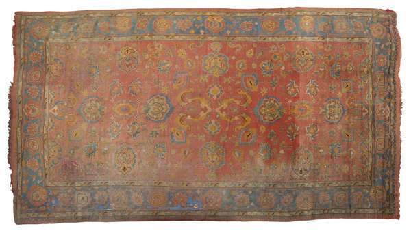 the rose field with allover palmette, arabesque and vine pattern, within blue palmette and vine border between bands