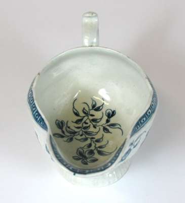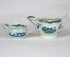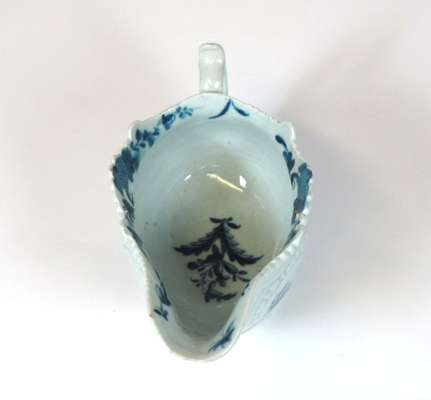 of shaped moulded form with scroll handle, decorated with flowers, blue cresent mark, 18.5cm wide, 10.5cm high; together with an English blue and white sauceboat, of shaped moulded form decorated with Chinese figures in a landscape and flowers, 13.5cm wide, 7cm high (2)