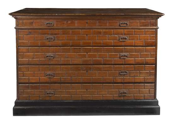 the rectangular top above five long drawers with carved brickwork decoration, raised on a later ebonised plinth base