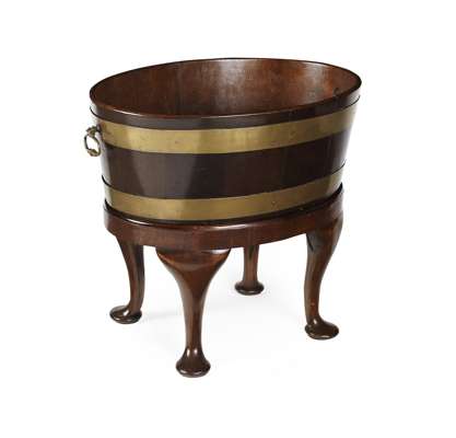 the oval cooler with brass loop handles, on a conforming stand with cabriole legs ending on pad feet