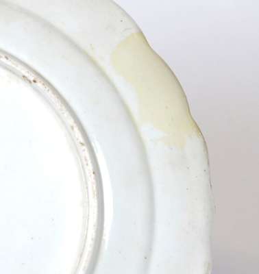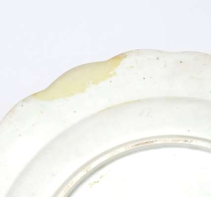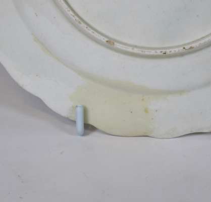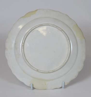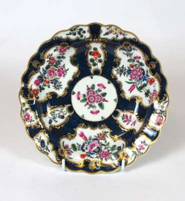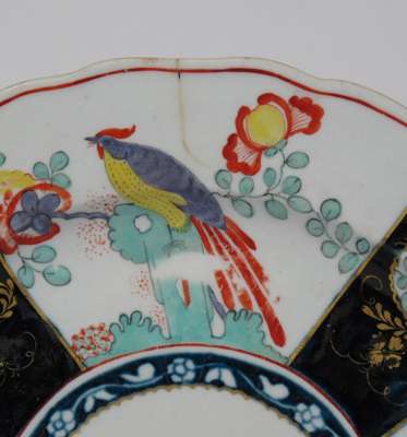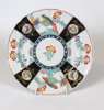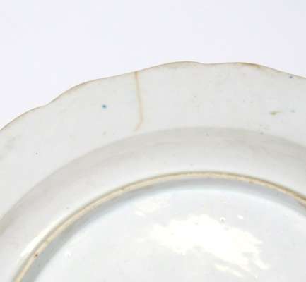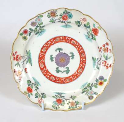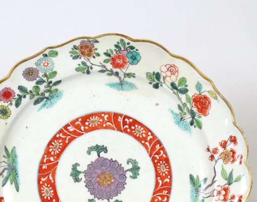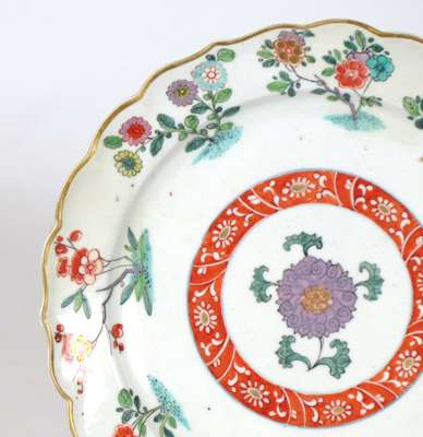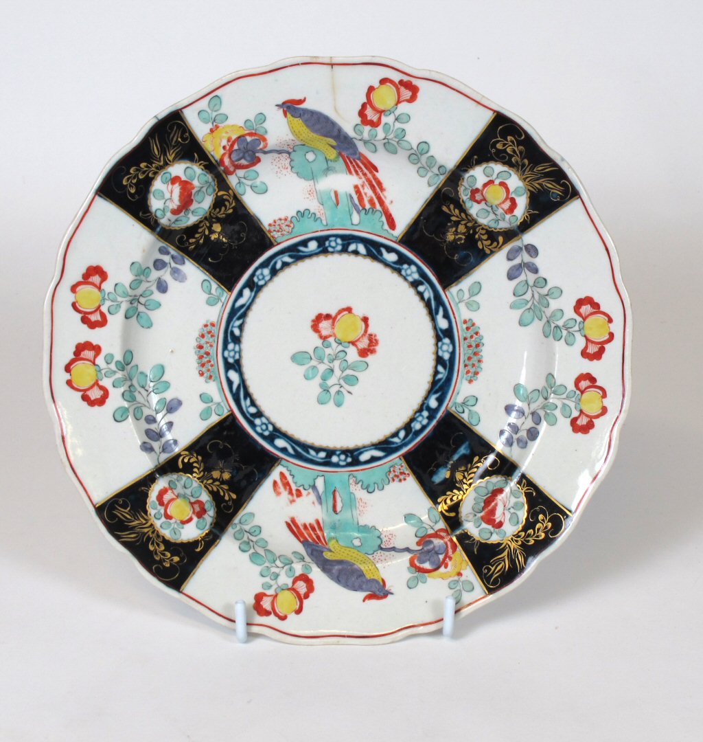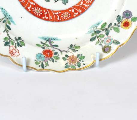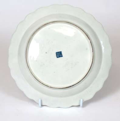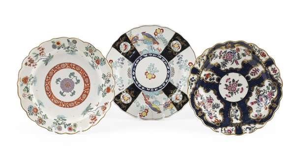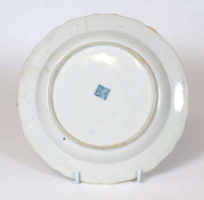 comprising a plate with scalloped edge with floral sprays set in reserves within a blue scale ground border and gilt highlights, square mark, 19.5cm wide; a plate with Japan pattern, square mark, 21.5cm wide; and a plate with Japan pattern, gilt 'S' mark, 20cm wide (3)