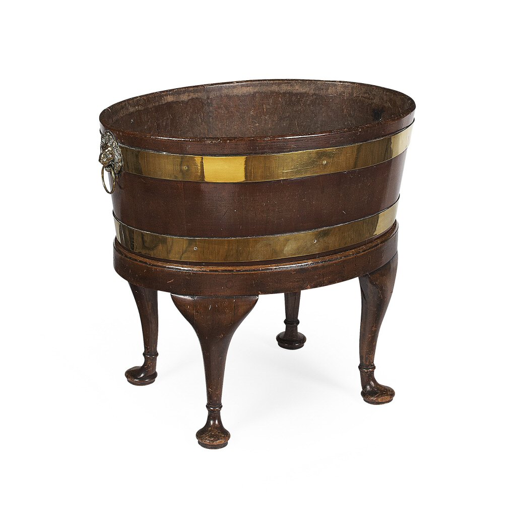 the oval brass bound tub with lion mask loop handles, the stand with cabriole legs ending on pad feet
