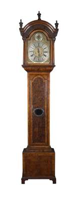 the moulded dome hood with urn finials over a brass and steel dial with Roman and Arabic chapters, subsidiary moon phase and seconds dials, and date aperature, the case with a glazed aperature and inlaid with a burl wood panel, eight day movement