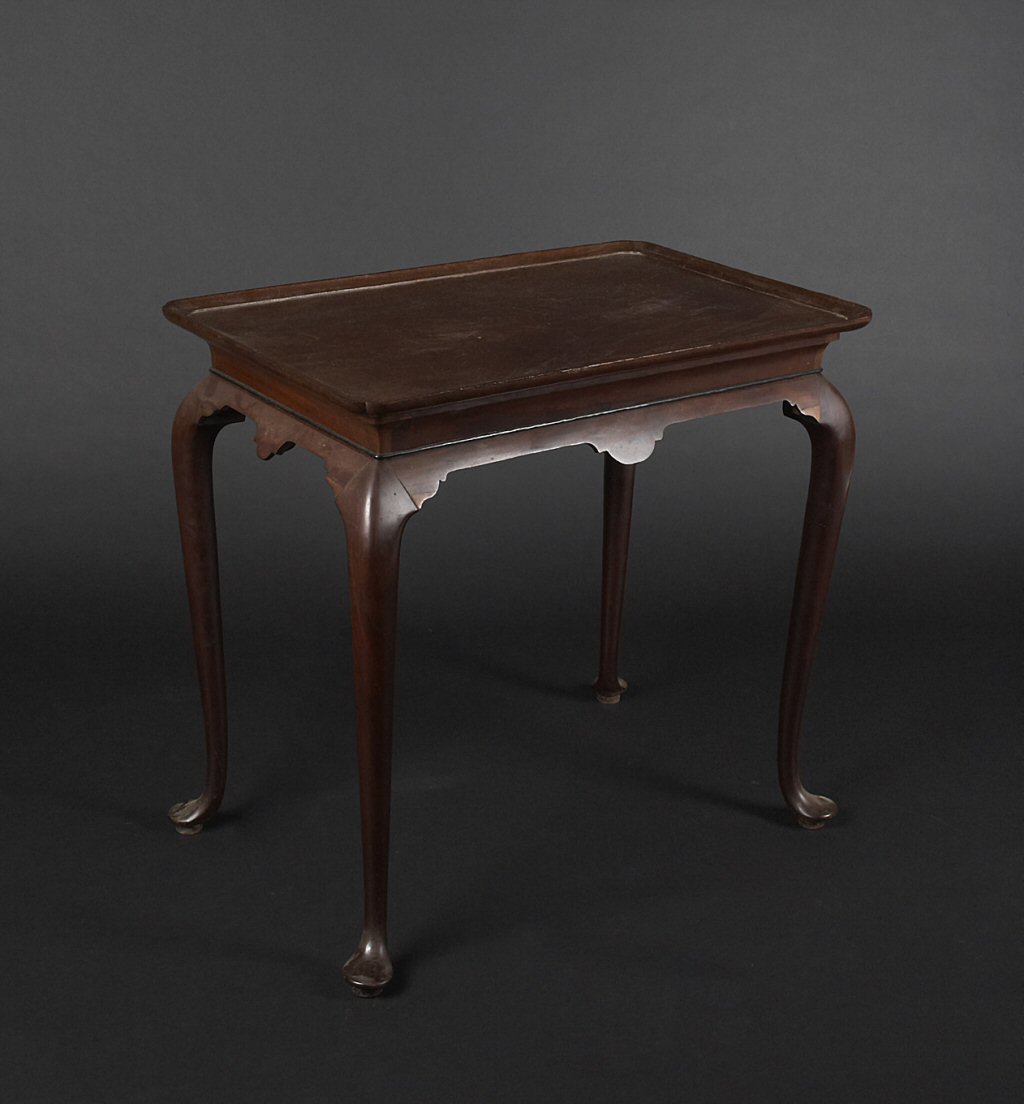 the rectangular dished top with notched corners above a shaped apron and raised on slender cabriole legs ending on pad feet
