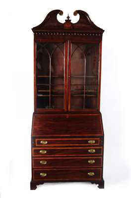in two parts; the swan neck pediment over twin astragal glazed doors opening to shelves, over a slant front opening to a fitted interior, above one short and three long drawers, and raised on bracket feet