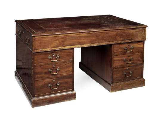 the rectangular top with and insert red leather embossed writing surface, over a plain frieze with drawers to each end, raised on two banks of three drawers on a plinth base