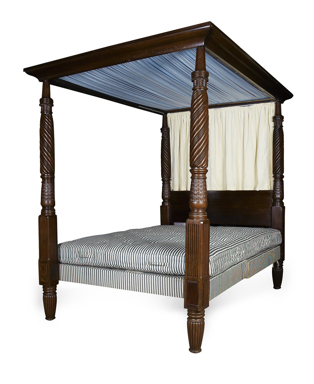 the later moulded tester frame raised on large spiral and leaf carved posts, fitted with a Heal's ticking covered base and mattress