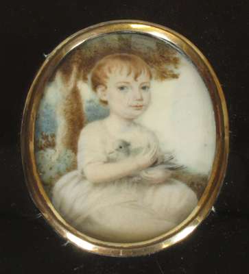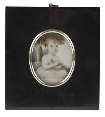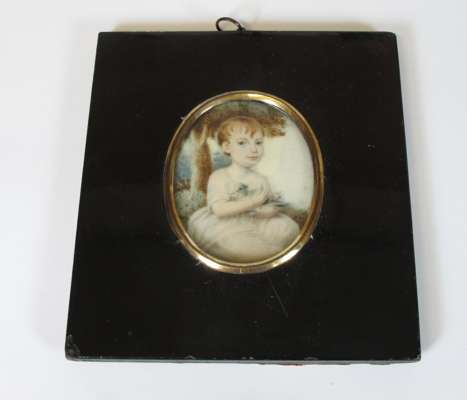 depicting a young girl holding a dove, in an ebonised frame, a label on the back identifies the sitter as "Charlotte Coldstream at the age of 18 months in 1802. Presented to Joseph Johnstone on his marriage in 1820 by her father Robert Coldstream"