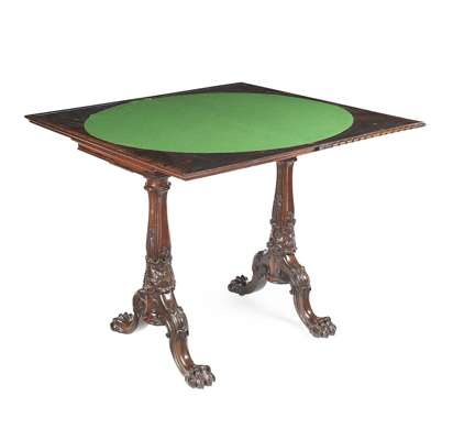 the foldover rectangular top with a carved moulded edge opening to a green baize playing surface, raised on foliate carved trestle supports and terminating on lion paw feet
