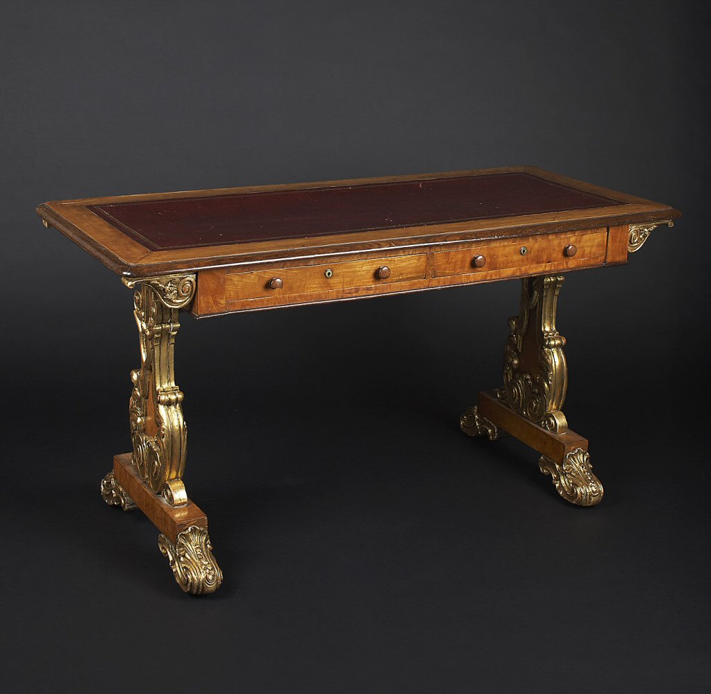 the rectangular top with a moulded edge and a red leather insert surface, over two short frieze drawers, raised on acanthus carved end trestle supports with gilt foliate feet