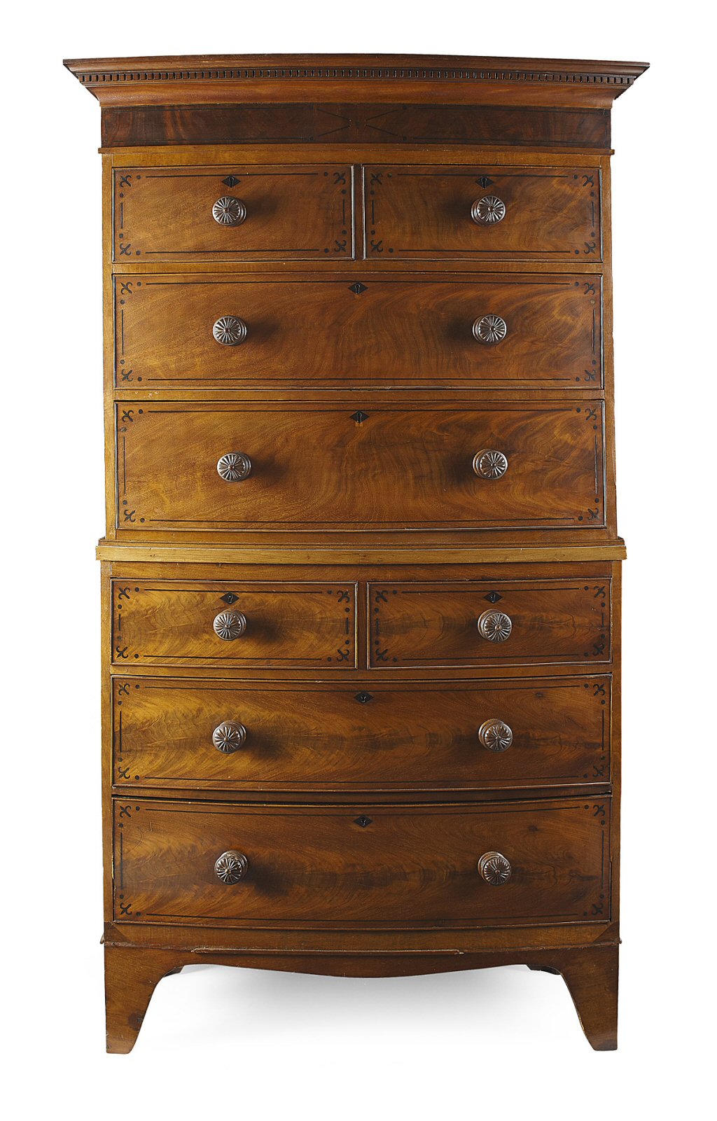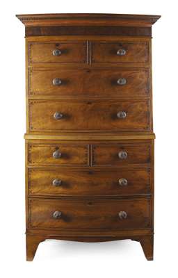 the dentil moulded cornice over a deep frieze and two short and two long drawers; the lower part with a further two short and two long drawers, on bracket feet, the whole outlined with ebonised stringing and marked at the corners with fleurs de lys